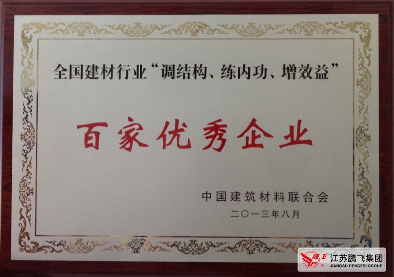 為樹(shù)立典型,有效遏制經(jīng)濟(jì)效益下滑,推進(jìn)建材行業(yè)調(diào)整結(jié)構(gòu)和轉(zhuǎn)型升級(jí),弘揚(yáng)正能量,發(fā)揮優(yōu)秀企業(yè)的典型示范作用,促進(jìn)行業(yè)科學(xué)發(fā)展,中國(guó)建材聯(lián)合會(huì)與各省市地方建材行業(yè)協(xié)會(huì)聯(lián)手開(kāi)展推薦表彰“調(diào)結(jié)構(gòu)、練內(nèi)功、增效益”百家優(yōu)秀企業(yè)評(píng)比表彰活動(dòng)。江蘇鵬飛集團(tuán)強(qiáng)抓市場(chǎng)機(jī)遇,堅(jiān)持科學(xué)發(fā)展之路,創(chuàng)新經(jīng)營(yíng)模式,被授予“調(diào)結(jié)構(gòu)、練內(nèi)功、增效益”百家優(yōu)秀企業(yè)榮譽(yù)稱號(hào)。