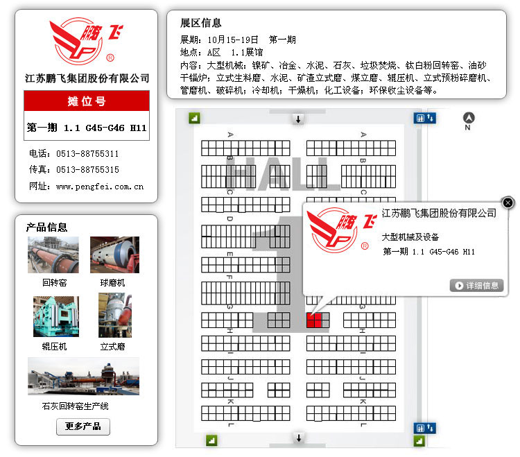 江蘇鵬飛集團在廣交會上精心布置展位,印發(fā)各類設備的介紹手冊,整體模型展示水泥生產線產品,委派具有多年工作經驗的銷售、技術、售后等專業(yè)工作人員為顧客詳細介紹新產品、新技術,全面分析解答各類設備從購買到投產使用以及售后服務等每個環(huán)節(jié)的問題,為您排疑解難,與您達成共識。同時,也希望能和更多的國內外公司加強聯系,互相合作,為客戶提供更加完美的產品。