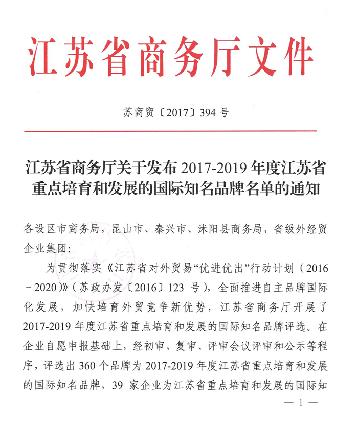 近日,省商務(wù)廳公布“2017-2019年度江蘇省重點(diǎn)培育和發(fā)展的國(guó)際知名品牌”名單,經(jīng)過(guò)層層評(píng)比,江蘇鵬飛集團(tuán)榮膺在列。