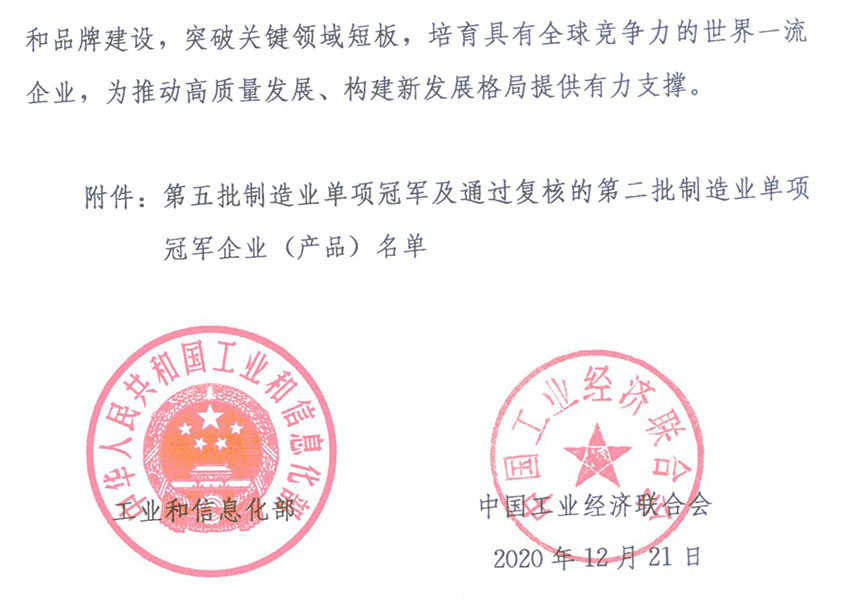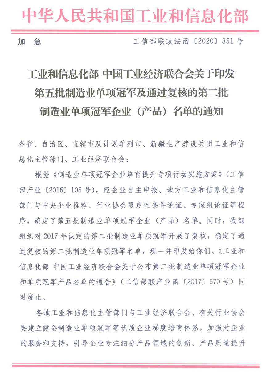 再次奪得“制造業(yè)單項冠軍示范企業(yè)”稱號