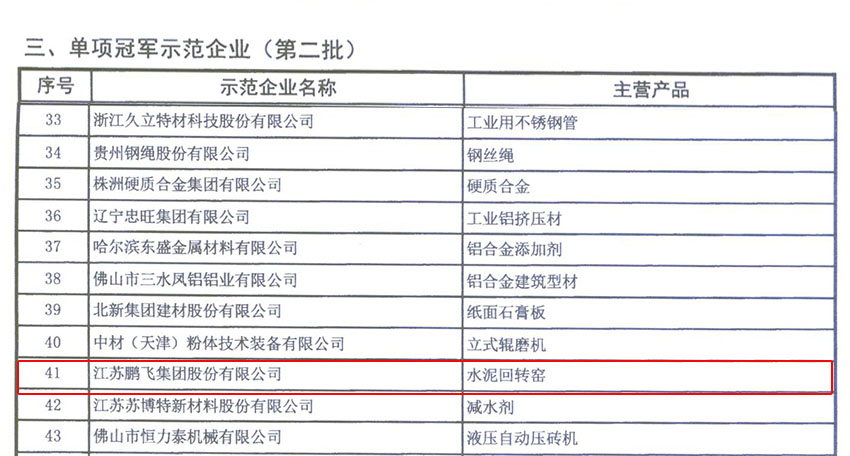 江蘇鵬飛集團股份有限公司榮獲國家制造業(yè)單項冠軍示范企業(yè)稱號,憑借的是主營產(chǎn)品水泥回轉(zhuǎn)窯的雄厚制造實力。