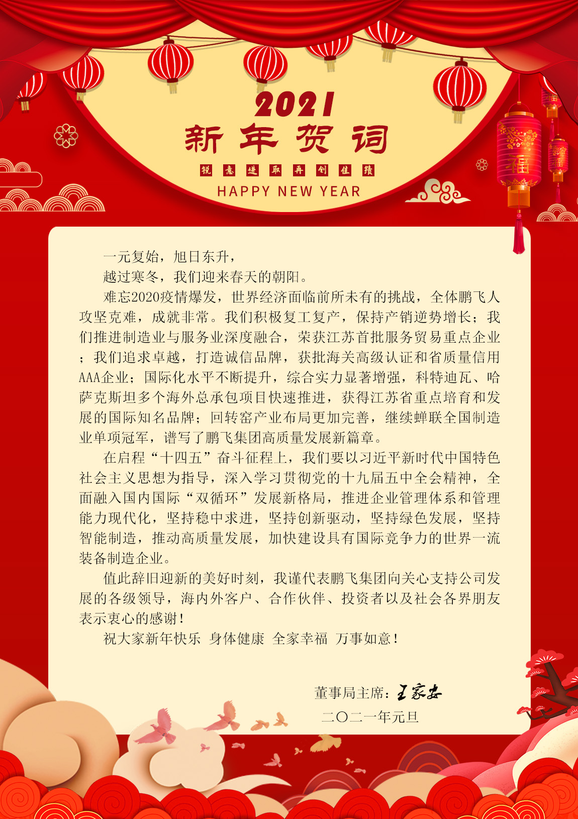 值此辭舊迎新的美好時刻,我謹代表鵬飛集團向關心支持公司發(fā)展的各級領導,海內(nèi)外客戶、合作伙伴、投資者以及社會各界朋友表示衷心的感謝!