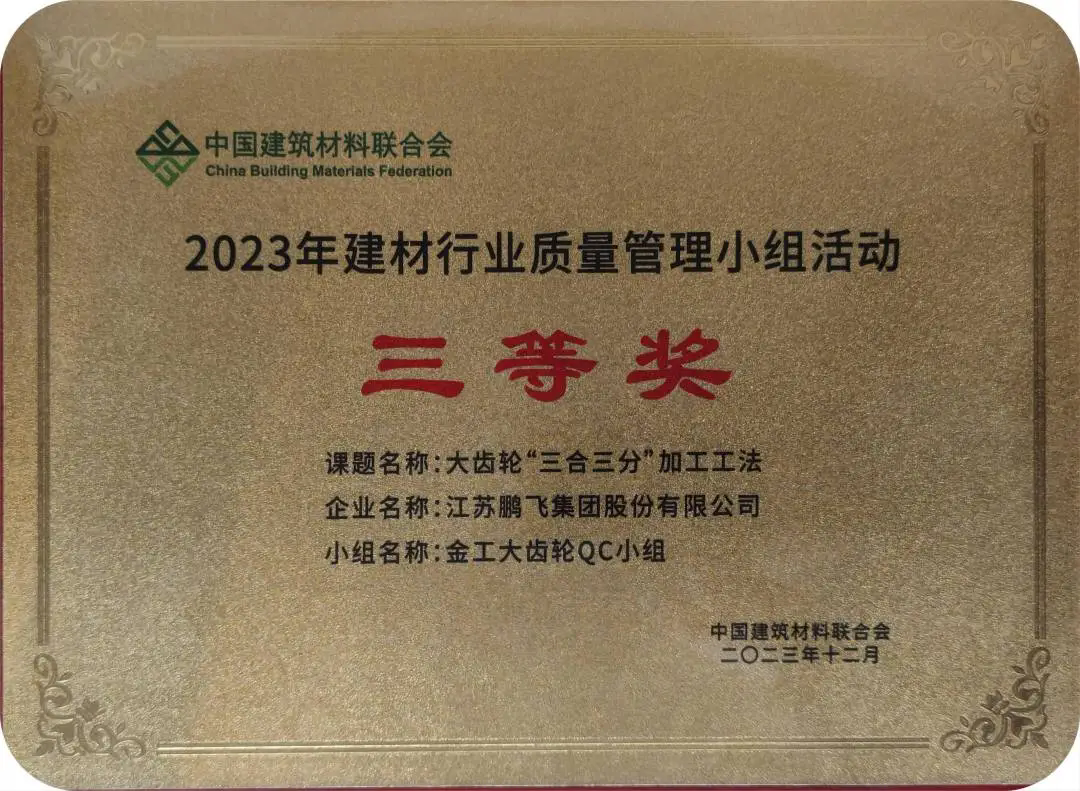 近期,中國建筑材料聯(lián)合會組織召開第三十九次建材行業(yè)質(zhì)量管理小組代表大會暨質(zhì)量信得過班組經(jīng)驗(yàn)交流大會,會上頒發(fā)了2023年建材行業(yè)優(yōu)秀質(zhì)量管理小組和質(zhì)量信得過班組、先進(jìn)個人和優(yōu)秀組織榮譽(yù)證書。鵬飛金工大齒輪“三合三分”加工工法獲得“2023年建材行業(yè)優(yōu)秀質(zhì)量管理小組三等獎”;輥壓機(jī)二組QC小組的輥壓機(jī)鑄釘輥制造工藝研究與改進(jìn)獲得“2023年建材行業(yè)優(yōu)秀質(zhì)量管理小組優(yōu)秀獎”,同時QC小組獲評“我最喜愛的質(zhì)量管理小組”。