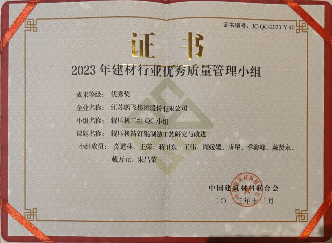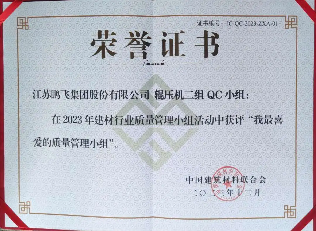 會上,鵬飛集團(tuán)作了2024年建材行業(yè)質(zhì)量管理小組活動成果和質(zhì)量信得過班組建設(shè)典型經(jīng)驗(yàn)發(fā)表,以下是鵬飛輥壓機(jī)二組QC小組的課題。