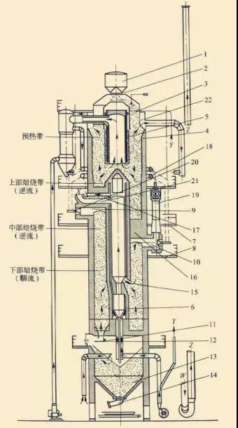 1.料斗;2.料口;3.加料斗;4.外筒;5.上內(nèi)筒;6.下內(nèi)筒;7.上燒嘴平臺(tái);8.下燒嘴平臺(tái);9.上燃燒室;10.下燃燒室;11.液壓推桿系統(tǒng);12.出料臺(tái);13.石灰倉;14.振動(dòng)出料機(jī);15.循環(huán)氣體入口;16.拱橋;17.冷卻梁;18.環(huán)形管道;19.噴射器;20.燒嘴;21.循環(huán)氣體管道;22.環(huán)形煙道。