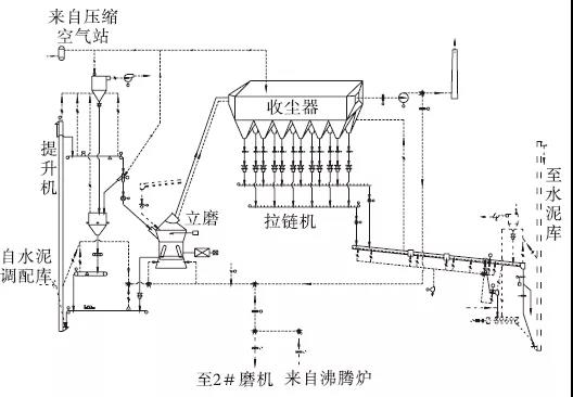 生產(chǎn)P·O42.5水泥時(shí)工藝流程是:熟料、石膏、石灰石、粉煤灰、礦渣等物料經(jīng)輸送設(shè)備輸送至各配料倉(cāng),粉煤灰從粉煤灰?guī)煜陆?jīng)輸送設(shè)備進(jìn)入生產(chǎn)系統(tǒng)。各種物料按一定比例設(shè)定,分別經(jīng)各定量給料機(jī)和輸送設(shè)備送至入磨鎖風(fēng)閥后入磨。入磨物料在磨內(nèi)進(jìn)行烘干和粉磨,粉磨后的物料經(jīng)選粉機(jī)分離,粗粉返回磨盤重新粉磨,合格細(xì)粉隨氣流直接進(jìn)入袋式收塵器進(jìn)行收集,收集下來的成品經(jīng)空氣斜槽、斗式提升機(jī)等輸送設(shè)備入水泥庫(kù)儲(chǔ)存;立磨吐渣經(jīng)輸送設(shè)備(設(shè)有除鐵器)進(jìn)入循環(huán)斗式提升機(jī),提升入磨后繼續(xù)粉磨。沸騰爐提供的熱風(fēng)與循環(huán)風(fēng)、冷風(fēng)混合后進(jìn)入磨內(nèi),磨內(nèi)混合風(fēng)起到烘干和提升物料的作用,出磨氣流進(jìn)入布袋收塵器;出布袋收塵器的氣體經(jīng)循環(huán)風(fēng)機(jī)后一部分經(jīng)循環(huán)風(fēng)管,作為循環(huán)風(fēng)入磨,其余氣體經(jīng)煙囪排入大氣。系統(tǒng)工藝流程見圖1。