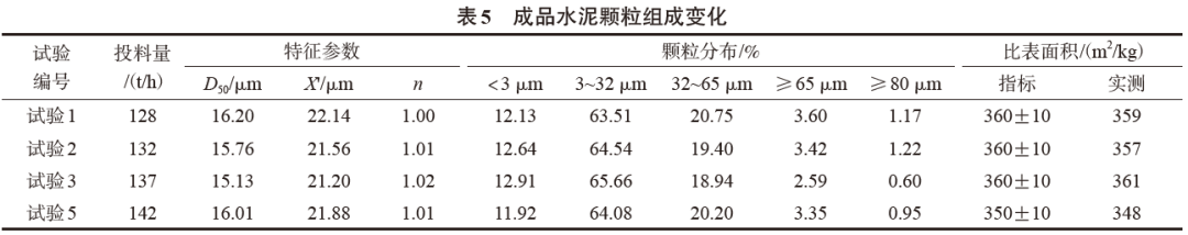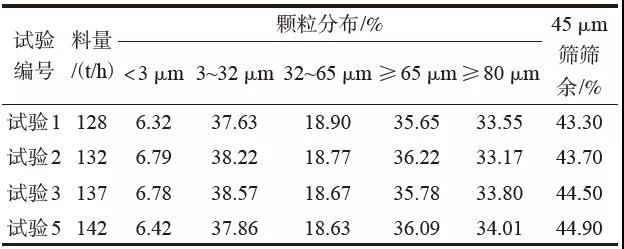 關(guān)閉和開啟不同格數(shù)的分料閥進(jìn)行生產(chǎn),分別標(biāo)定磨機產(chǎn)量,并對粉磨過程中各點物料進(jìn)行取樣,測定物料顆粒組成及物理性能、與外加劑相容性。然后對加工過程中各點物料粒度變化情況進(jìn)行比較后進(jìn)行質(zhì)量指標(biāo)的調(diào)整(試驗5)。