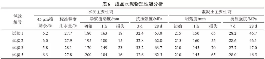 成品水泥顆粒組成變化分析見表5,成品水泥物理性能變化見表6。其中,(1)水泥凈漿流動度和混凝土坍落度試驗中減水劑均使用JY公司生產(chǎn)的PS-1型聚羧酸減水劑;(2)水泥凈漿流動度試驗依照GB/T 8077—2012《混凝土外加劑勻質(zhì)性試驗方法》進(jìn)行,減水劑摻入量為水泥質(zhì)量的0.8%;(3)混凝土強度等級為C30,依照J(rèn)GJ 55—2011《普通混凝土配合比設(shè)計規(guī)程》進(jìn)行的相同配合比設(shè)計,減水劑摻入量為膠凝材料質(zhì)量(水泥、粉煤灰和礦粉)的2.0%,膠凝材料和骨料均為同一進(jìn)廠批次,坍落度試驗依照GB/T 50080—2016《普通混凝土拌合物性能試驗方法標(biāo)準(zhǔn)》進(jìn)行。