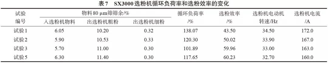 SX3000型選粉機系統(tǒng)循環(huán)負(fù)荷率和選粉效率對比見表7。