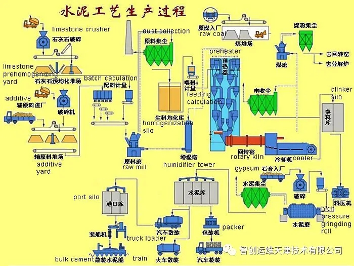 4.生產(chǎn)工藝:硅酸鹽水泥生產(chǎn)的大體步驟是:先把幾種原材料按適當(dāng)?shù)谋壤浜虾煤笤谀C(jī)中磨成生料;然后將制得的生料入窯進(jìn)行煅燒;再把燒好的熟料配以適當(dāng)?shù)氖啵ê突旌喜牧希┰谀C(jī)中磨成細(xì)粉,即得水泥。硅酸鹽系水泥的生產(chǎn)概括起來就是“兩磨一燒”。生料制備:石灰質(zhì)原料,粘土質(zhì)原料與少量校正原料經(jīng)破碎后,按一定比例配合、磨細(xì),并配合為成分合適,質(zhì)量均勻的生料熟料煅燒:生料在水泥窯內(nèi)煅燒至部分熔融所得以硅酸鈣為主要成分的硅酸鹽水泥熟料水泥粉磨:熟料加適量石膏,有時(shí)還加適量混合材料或外加劑共同磨細(xì)為水泥生產(chǎn)方法①干法生產(chǎn) 將原料同時(shí)烘干并粉磨,或先烘干經(jīng)粉磨成生料粉后喂入干法窯內(nèi)煅燒成熟料的方法。但也有將生料粉加入適量水制成生料球,送入立波爾窯內(nèi)煅燒成熟料的方法,稱之為半干法,仍屬干法生產(chǎn)之一種。②濕法生產(chǎn) 將原料加水粉磨成生料漿后,喂入濕法窯煅燒成熟料的方法。也有將濕法制備的生料漿脫水后,制成生料塊入窯煅燒成熟料的方法,稱為半濕法,仍屬濕法生產(chǎn)之一種。 干法和濕法生產(chǎn)特點(diǎn)①干法生產(chǎn)特點(diǎn):干法是將生料粉直接送入窯內(nèi)煅燒,入窯生料的含水率一般僅1%~2%,省去了烘干生料所需的大量熱量。不僅可以制備出質(zhì)量均勻的生料而且逐步向大型方向發(fā)展?,F(xiàn)在將懸浮預(yù)熱和預(yù)分解窯統(tǒng)稱為新型干法窯,它們成為干法生產(chǎn)今后發(fā)展的方向。②濕法生產(chǎn)特點(diǎn):將生料制成含水32%一36%的料漿,在回轉(zhuǎn)窯內(nèi)將生料漿烘干并燒成熟料。濕法制備料漿,粉磨能耗較低,約低30%,料漿容易混勻,生料成分穩(wěn)定,有利于燒出高質(zhì)量的熟料。但球磨機(jī)易磨件的鋼材消耗大,熟料出窯溫度較低,不宜燒高硅酸率和高鋁氧率的熟料。