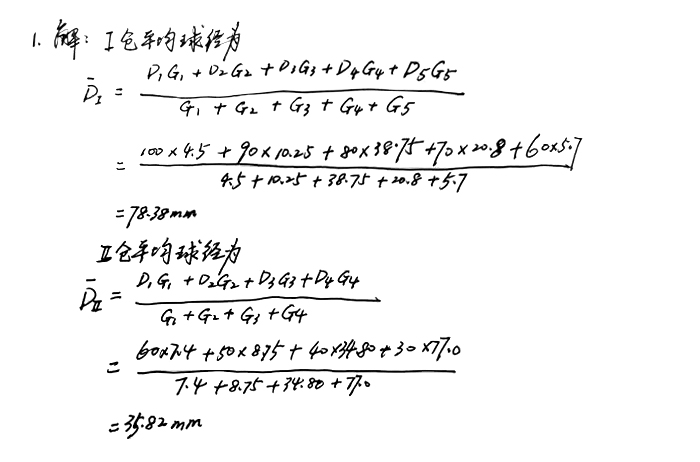 1、φ4.2*12m磨機(jī)鋼球級配方案是Ⅰ倉:φ100mm的4.5t,φ90mm的10.25t,直徑80mm的38.75t,φ70mm的20.80t,φ60mm的5.70t;Ⅱ倉:φ60mm的7.40t,φ50mm的8.75t,φ40mm的34.80t,φ30mm的77.0t,求Ⅰ、Ⅱ倉的平均球徑。